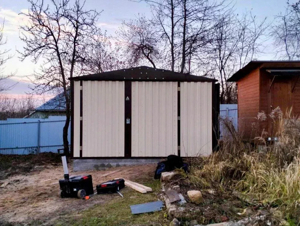 Изготовили конструкцию размером 4 х 6 м с двускатной крышей и торцевой воротной группой, которую сместили влево для удобного и комфортного въезда в гараж. Окрас гараж получил в популярную в последнее время комбинацию цветов RAL 1015 для основных элементов и RAL 8017 для фасонных элементов и крыши. Очень красивая расцветка, которая добавляет особый стиль и шарм не только самой конструкции, но и участку в целом.