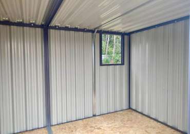 Нами была изготовлена 4-метровая конструкция с плоской крышей и двумя воротными группами (торцевой и боковой) в популярном стильном цвете RAL 7024. Дополнительно хозблок оборудовали большим световым окном.