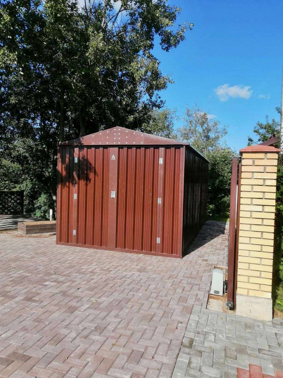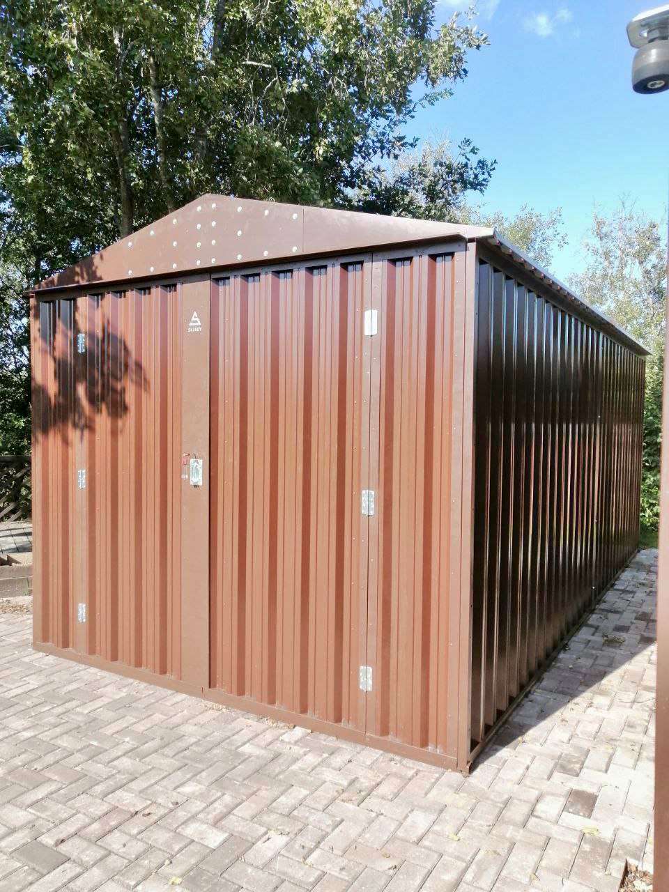 Нами была изготовлена конструкция размером 6 х 3 м с двускатной крышей и торцевой воротной группой в популярнейшем шоколадно-коричневом цвете RAL 8017.