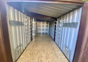 Нами была изготовлена стандартная 5-метровая конструкция с односкатной крышей и торцевой воротной группой в популярном шоколадно-коричневом цвете RAL 8017. Дополнительно на лицевую сторону конструкции был нанесен принт «под дерево».