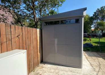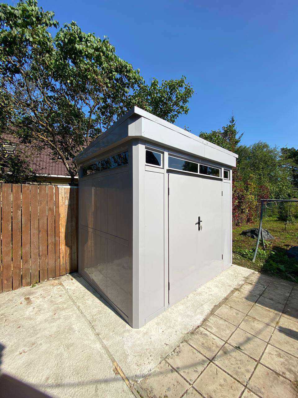 Нами была изготовлена люксовая конструкция размером 2,2 х 2,9 х 2,69 м с односкатной крышей в светло-сером цвете RAL 7004.