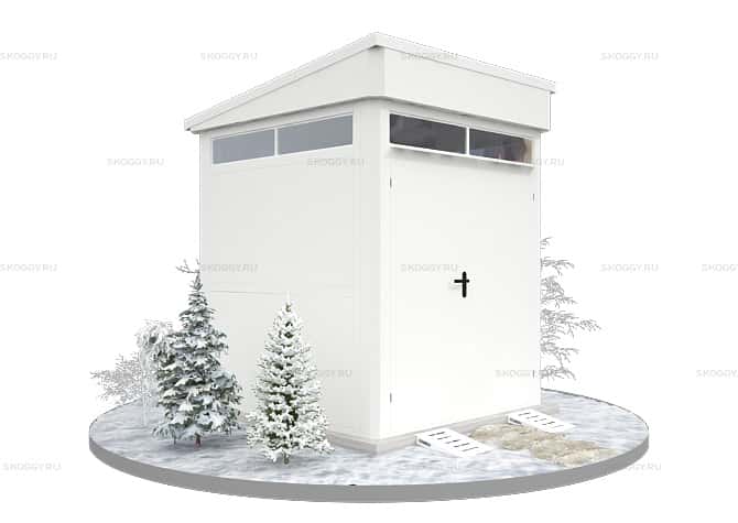 По своей конструкции контейнер Skoggy представляет модульное сооружение, которое состоит из сборных элементов. При сборке элементы устанавливаются один в другой и фиксируются болтовыми соединениями. Конструкция дверей, крыши и стен представляют собой каркас из сложногнутого профиля толщиной 0,7 мм. Каркас обшивается профлистом НС-35 толщиной 0,45-0,55 мм. Такая толщина оптимальна для обеспечения прочности и устойчивости конструкции.