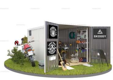 Сам хозблок SKOGGY производится из металла - каркас делается из швеллера и уголка, а фасад из оцинкованного профлиста. Прочная и герметичная крыша выдерживает любые снеговые нагрузки, на нее даже можно поставить второй этаж, так как кровля выдерживает до 250/м.кв. Пол также состоит из металлической основы и плиты ОСБ-18 мм. По желанию его можно застелить любым покрытием - линолеумом, ламинатом и т.д.